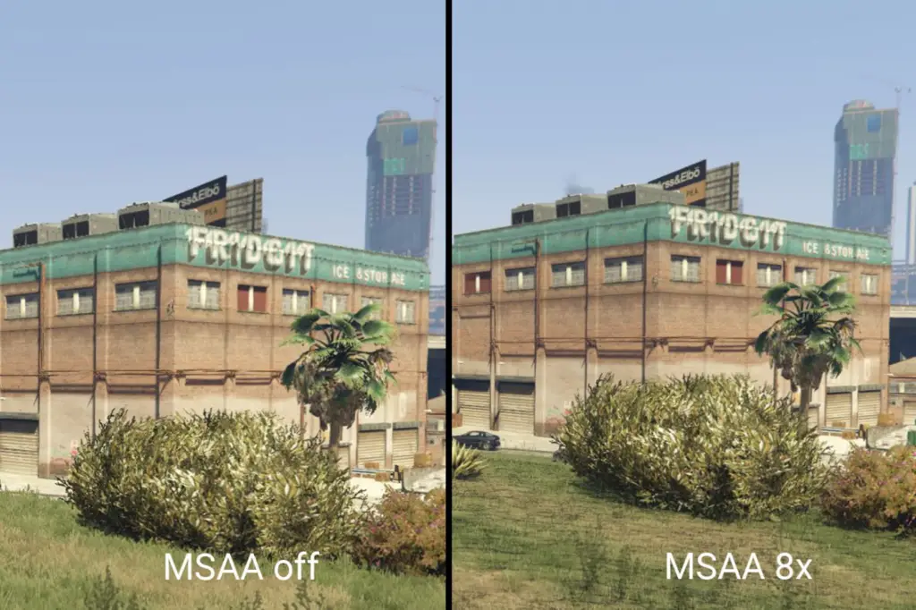 For this reason, developers add anti-aliasing technology to their games. It was invented back in 1972, but it began to gain popularity in the game industry only a few decades later. The anti-aliasing is to paint the neighboring pixels in an intermediate color (or color gradient). The jagged transition will then appear less sharp, thereby anti-aliasing out the boundary.